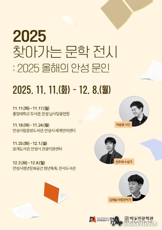 이번 '찾아가는 문학 전시'는 안성 문학 진흥사업 선정 ‘2025 올해의 안성 문인’을 홍보하기 위해 진행되는 관내 기관 순회전시이다. 전시 현장에는 이동식 전시 패널과 문학 퀴즈 부스가 설치되며, 시민 누구나 자유롭게 관람할 수 있다. 예정된 전시 일정 및 장소는 ▲중앙대학교 도서관・안성 남사당공연장(11.11.~11.17.) ▲안성시립중앙도서관・안성시 세계언어센터(11.18.~11.24.) ▲보개도서관・안성시관광지원센터(11.25.~12.01.) ▲안성시청년문화공간 청년톡톡・진사도서관(12.02.~12.08.) 순이다.
