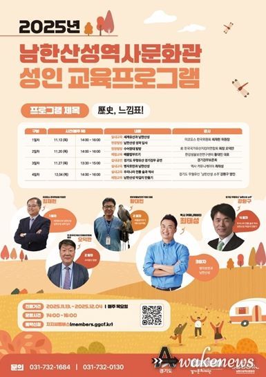 어웨이크뉴스 오경하 기자 | 경기문화재단 남한산성역사문화관은 오는 11월 13일부터 12월 4일까지 매주 목요일, 성인을 대상으로 한 인문 교양 프로그램 〈歷史(역사), 느낌표!〉를 운영한다. 이번 프로그램은 세계유산 남한산성의 역사와 문화를 다양한 관점에서 탐구하며, 세계유산의 가치를 이해할 수 있도록 기획됐다.