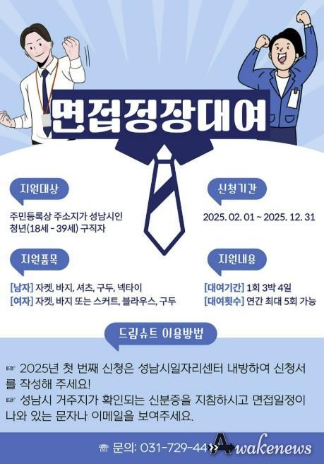 어웨이크뉴스 오경하 기자 | 성남시는 사회에 첫발을 내딛는 청년 구직자의 취업 준비를 지원하고 경제적 부담을 덜어주기 위해 ‘청년 면접정장 무료 대여사업’을 확대 실시한다.