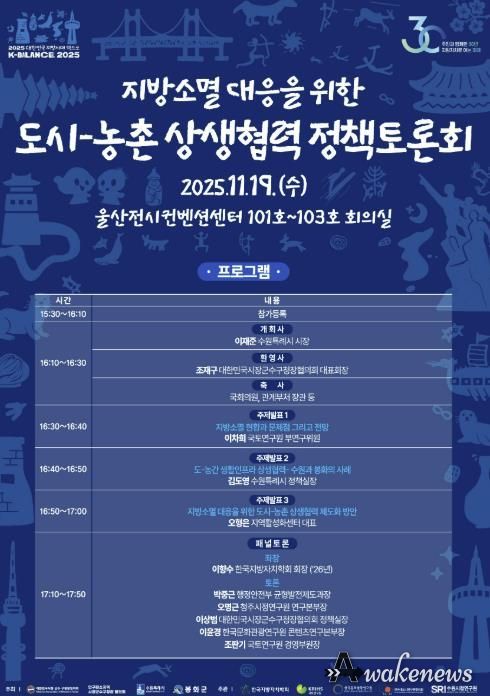 수원특례시(시장 이재준)는 11월 19일 오후 4시 울산전시컨벤션센터 1층에서 ‘지방소멸 대응을 위한 도시–농촌 상생협력 정책토론회’를 개최한다.