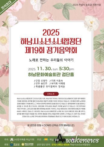 어웨이크뉴스 오경하 기자 | 꿈과 희망을 노래하는 하남시소년소녀합창단의 제19회 정기음악회가 오는 11월 30일(일) 오후 5시 30분, 하남문화예술회관 검단홀에서 열린다.