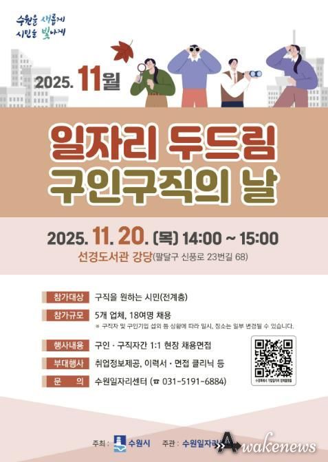 어웨이크뉴스 오경하 기자 | 수원특례시는 20일 오후 2시부터 3시까지 선경도서관 강당에서 ‘11월 일자리 두드림 구인·구직의 날’을 연다.