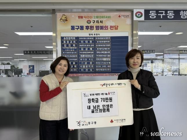 어웨이크뉴스 오경하 기자 | 구리시 동구동 행정복지센터는 지난 18일 동구동 행정복지센터 대회의실에서 '내 남은 인생은 골프와 함께' 모임으로부터 관내 취약계층 청소년을 위한 장학금 70만 원을 기탁받았다고 밝혔다.