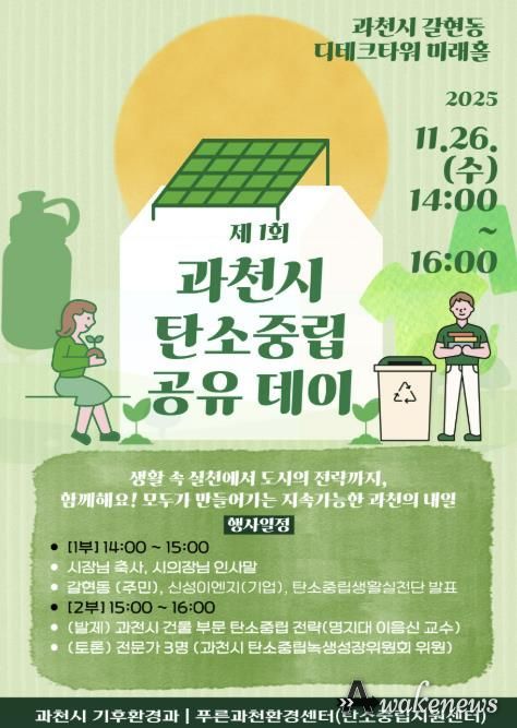 어웨이크뉴스 오경하 기자 | 과천시는 오는 26일 갈현동 디테크타워 미래홀에서 ‘2025년 과천시 탄소중립 공유데이’를 개최한다고 20일 밝혔다.