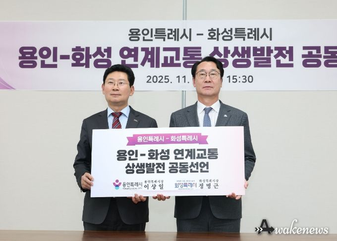 어웨이크뉴스 오경하 기자 | 화성특례시와 용인특례시는 21일 고양시청 백석별관 투자회의실에서 ‘화성-용인 연계교통 상생발전 공동선언문’을 발표하고, 반도체 메가시티의 핵심 축으로서 양 도시가 긴밀히 협력할 것을 천명했다.