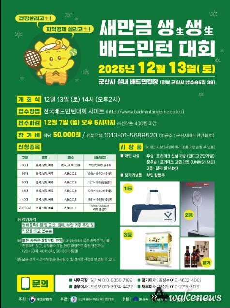 - 새만금 생생배드민턴 대회 개최, 12월 7일까지 400팀 선착순 모집