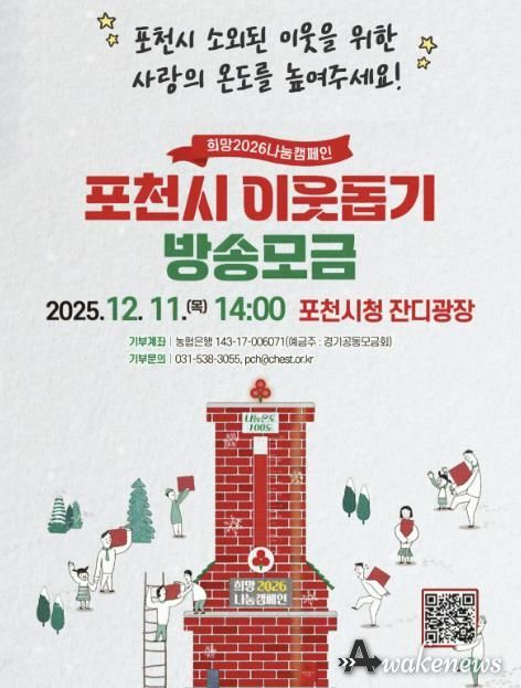 어웨이크뉴스 오경하 기자 | 포천시는 복지사각지대를 해소하고 안정적인 복지재원 마련을 위해 ‘행복을 더하는 기부, 기부로 바꾸는 포천’을 주제로 '희망2026 나눔 캠페인 포천시 이웃돕기 방송모금' 행사를 개최한다.