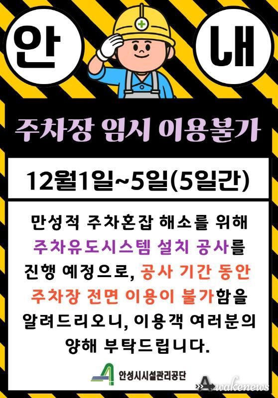어웨이크뉴스 오경하 기자 | 안성시시설관리공단은 12월 1일부터 5일까지 5일간 석정동 공영주차장 주차유도시스템 설치 공사로 해당 주차장 이용을 한시적으로 중단한다고 밝혔다.