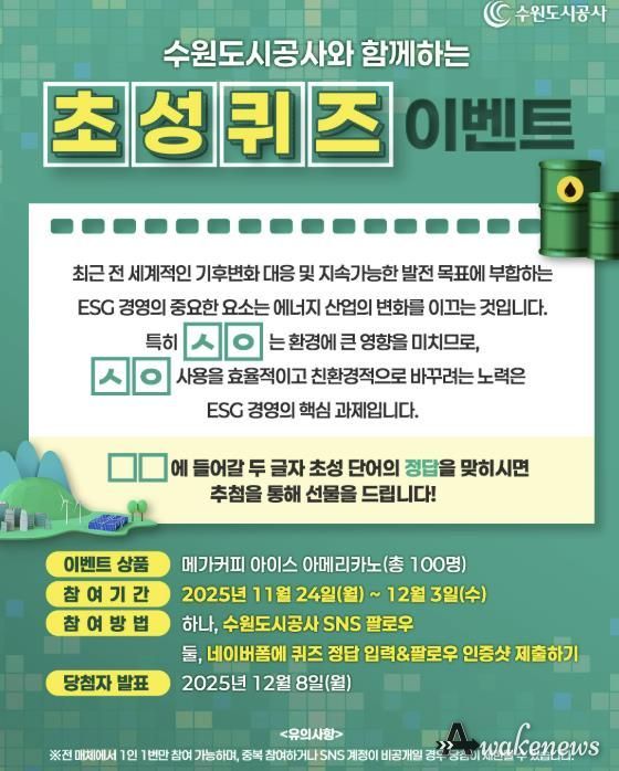 어웨이크뉴스 오경하 기자 | 수원도시공사는 ESG 경영 선도 일환으로 기후변화 대응과 관련한 SNS 이벤트를 실시한다고 24일 밝혔다.