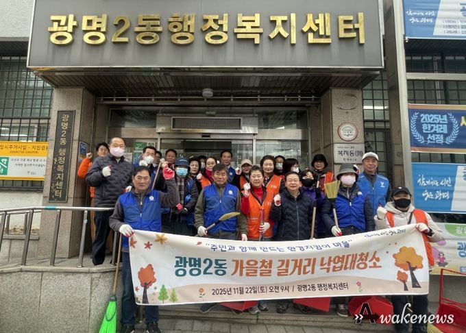 어웨이크뉴스 오경하 기자 | 광명시 광명2동 행정복지센터는 지난 22일 쾌적하고 깨끗한 거리 환경 조성을 위해 마을 주민과 단체원 30여 명이 참여한 가운데 가을철 낙엽 대청소를 실시했다.