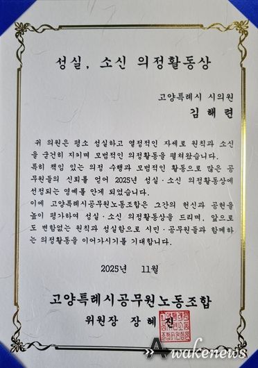 어웨이크뉴스 오경하 기자 | 고양특례시의회 건설교통위원회 김해련 의원(일산2동·정발산동·중산1·2동)은 21일 열린 고양시공무원노동조합 ‘2025년도 베스트시의원상’을 4년 연속 수상했다.