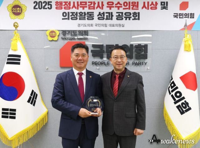 어웨이크뉴스 오경하 기자 | 경기도의회 경제노동위원회 정하용 의원(국민의힘, 용인5)은 24일, 국민의힘 회의실에서 열린 ‘2025년 행정사무감사 우수의원 시상식’에서 행정사무감사 우수위원으로 선정됐다. 이번 선정은 행정사무감사 기간 동안 도민생활과 직결된 핵심 현안들을 면밀히 점검하고, 구조적 문제를 드러내는 데 기여한 점이 높게 평가된 결과이다.