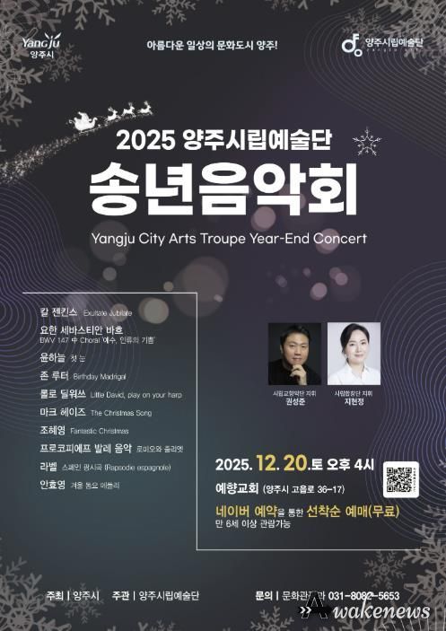 어웨이크뉴스 오경하 기자 | 양주시가 오는 12월 20일 오후 4시, 예향교회(고읍로 36-17)에서 ‘2025 양주시립예술단 송년음악회’를 개최한다.