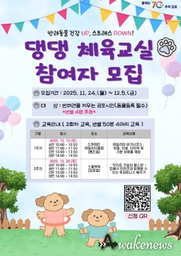 어웨이크뉴스 오경하 기자 | 김포시는 오는 12월 5일까지 반려견의 건강증진과 보호자와의 유대감 강화를 위해 반려문화교육 ‘댕댕 체육교실’ 참여자를 모집한다고 밝혔다.