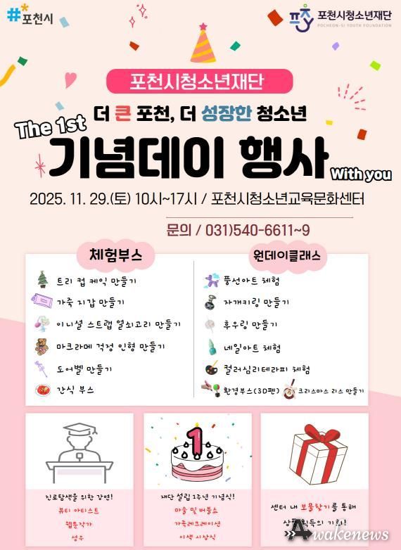 어웨이크뉴스 오경하 기자 | 포천시청소년재단은 재단 출범 1주년을 맞아 오는 29일 포천시청소년교육문화센터에서 ‘2025년 포천시청소년재단 1주년 기념행사 – 더 큰 포천, 더 성장한 청소년’을 개최한다.