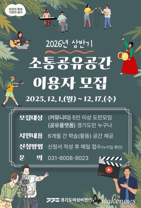 어웨이크뉴스 오경하 기자 | 경기도여성비전센터가 오는 12월 1일부터 2026년도 상반기 ‘소통공유공간’ 이용을 희망하는 정기 모임과 단체 20곳을 모집한다.