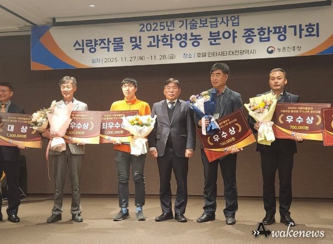 어웨이크뉴스 오경하 기자 | 김포시농업기술센터는 지난 11월 27일, 대전광역시 유성구 호텔 인터시티에서 열린 농촌진흥청의 ‘2025년 식량작물 및 과학영농분야 기술보급사업 종합평가회’에서 식량작물 기술보급 활성화 우수사례 경진 최우수 기관상을 수상했다.