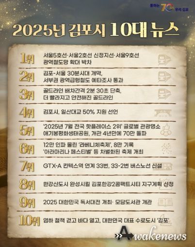 어웨이크뉴스 오경하 기자 | 2025년 김포시민에게 가장 사랑받은 김포시 정책은 ‘서울5호선·서울2호선 신정지선·서울9호선 광역철도망 확대 박차’(141표, 13%)인 것으로 집계됐다. 이외에도 2,3,4위까지 모두 ‘서부권광역급행철도 예타조사 통과’(12%), ‘골드라인 배차간격 2분 30초 단축’(10%), ‘일산대교 50% 지원 선언’(7%)이 선정, 7위에도 ‘GTX-A 킨텍스역 연계 33번, 33-2번 버스노선 신설(5%)’이 랭크돼 시민 관심이 교통이슈에 여전히 집중되어 있고, 현안을 해소하기 위한 노력이 시민들로부터 많은 공감과 응원을 받고 있음을 확인할 수 있었다.
