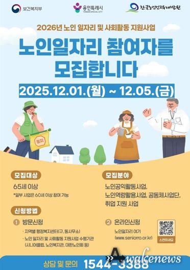 어웨이크뉴스 오경하 기자 | 용인특례시는 12월 1일부터 5일까지 ‘2026년 노인 일자리 및 사회활동 지원사업’ 참여자를 모집한다.