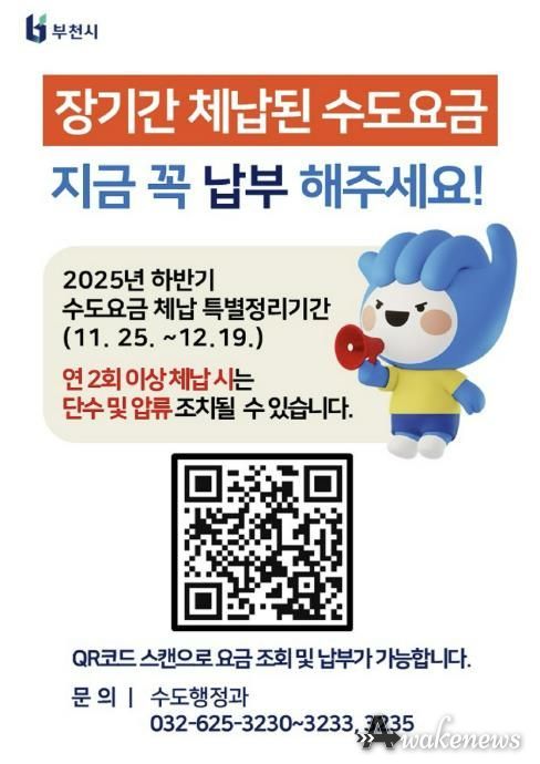 어웨이크뉴스 오경하 기자 | 부천시는 안정적인 수도 공급과 건전한 재정 운영을 위해 11월 25일부터 12월 19일까지 ‘수도요금 체납액 특별정리기간’을 운영하고 있다. 이에 따라 시는 체납 2회 이상 또는 체납액 20만 원 이상인 617건을 집중적으로 관리하며 징수 활동을 벌이고 있다.