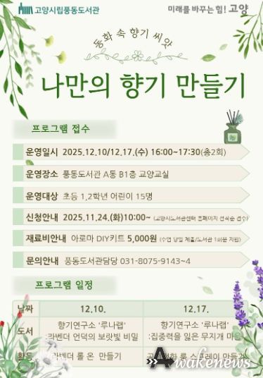 어웨이크뉴스 오경하 기자 | 고양특례시 풍동도서관은 공공도서관 독서문화 프로그램 ‘동화 속 향기 씨앗, 나만의 향기 만들기’를 운영한다.