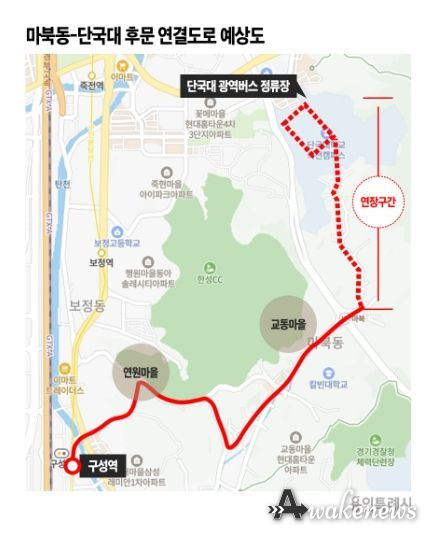 시는 마북동과 연결되는 단국대 후문 쪽 교내도로가 내년 초 정식으로 개통하면 502번 마을버스 노선을 단국대까지 연장해 운영을 시작할 예정이다. 단국대는 현재 후문에서 학교 안으로 연결하는 도로를 만드는 공사를 진행하고 있다. 시는 이미 후문으로 연결하는 도로 공사를 마친 상태다.