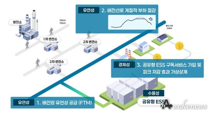 공유형 에너지저장장치(ESS)는 배전선로 과부하를 해소해 정전 등 재난을 예방하고, 가상상계로 다수의 수용가의 전기요금을 절감해 수익을 창출하는 효과가 있다.