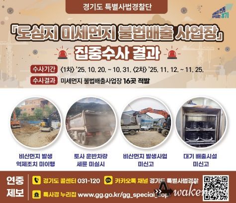 어웨이크뉴스 오경하 기자 | 경기도는 도심지 미세먼지 발생사업장 330개를 대상으로 불법 배출 행위를 집중 수사해 대기환경보전법 위반 사업장 16개를 적발했다고 9일 밝혔다.