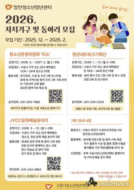 어웨이크뉴스 오경하 기자 | 수원시청소년청년재단 장안청소년청년센터는 2025년 12월 16일부터 청소년 수련시설 및 지역사회의 변화를 이끌어갈 청소년과 청년 지원자를 모집한다.