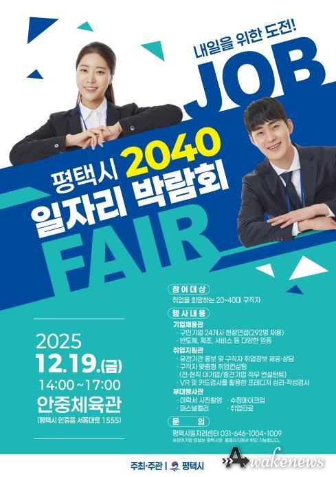 어웨이크뉴스 오경하 기자 | 평택시는 지역 내 우수기업과 청년층 구직자 간 만남의 장을 마련하고자 오는 19일 14시부터 17시까지 안중체육관에서 '평택시 2040 일자리박람회'를 개최한다고 밝혔다.