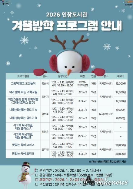 인창도서관은 1월 20일부터 2월 13일까지 초등 문해력 향상을 위한 글쓰기 수업 ‘나를 상상하는 글쓰기’를 비롯해, 책 읽기를 통해 과학 원리를 배우는 ‘책과 함께하는 과학 교실’, 그래비트랙스 교구를 활용한 ‘액션스톤과 함께 과학여행’, ‘체스클래스’, ‘맛있는 독서 요리’ 등 다양한 특강 프로그램을 운영해 따뜻한 겨울방학 학습의 기회를 제공한다.