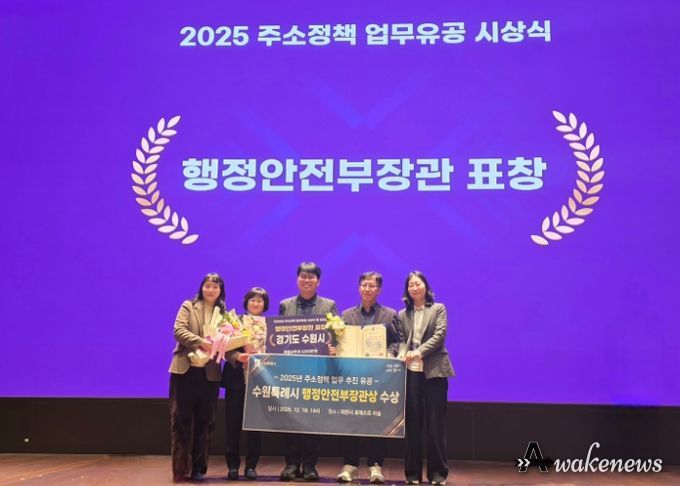 어웨이크뉴스 오경하 기자 | 수원특례시가 행정안전부 주관 ‘2025 주소정책 워크숍’에서 ‘2025 주소정책 업무 분야 우수기관’으로 선정돼 행정안전부 장관 표창을 받았다. 특별교부세 4000만 원도 확보했다.
