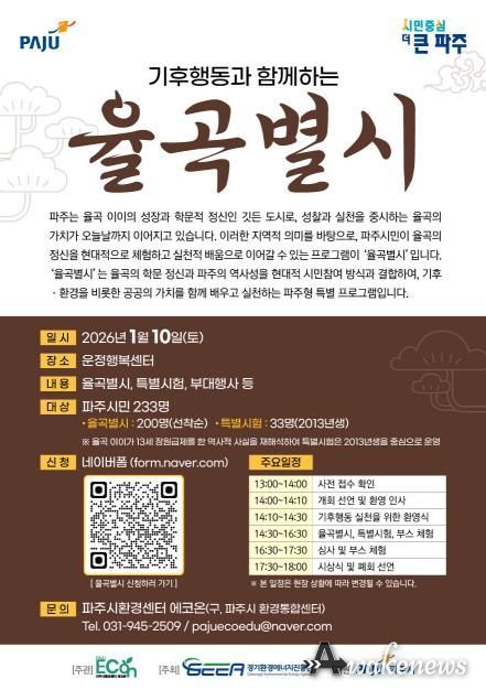 어웨이크뉴스 오경하 기자 | 파주시환경센터 ‘에코온’은 파주를 대표하는 조선시대 사상가 율곡 이이의 학문 정신을 현대적 기후행동 가치로 재해석한 기후문화축제 ‘기후행동과 함께하는 율곡별시’를 오는 내년 1월 10일 운정행복센터에서 개최한다.