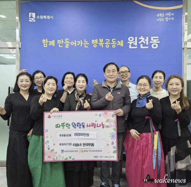 어웨이크뉴스 오경하 기자 | 지난 19일 한국무용반 강사 이송녀와 수강생들이 저소득 주민들을 돕기 위해 성금 50만 원을 원천동행정복지센터에 전달했다.