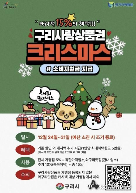 어웨이크뉴스 오경하 기자 | 구리시는 12월 24일부터 ‘구리사랑상품권 크리스마스 소비 지원금’을 지급한다고 밝혔다. 이번 소비 지원금은 연말연시 기간 지역 외로 유출되는 소비를 지역 내로 유도하고, 관내 상권 활성화와 소상공인 보호를 위해 마련됐으며, 예산 소진 시 조기 종료될 수 있다.