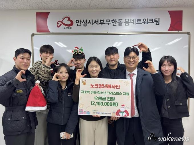 어웨이크뉴스 오경하 기자 | 안성시 노크청년봉사단은 지난 22일 사회복지법인 한길복지재단에서 수탁 운영하는 안성시서부무한돌봄네트워크팀에 저소득 아동·청소년 크리스마스 지원을 위한 후원금 2,100,000원을 전달했다고 밝혔다.
