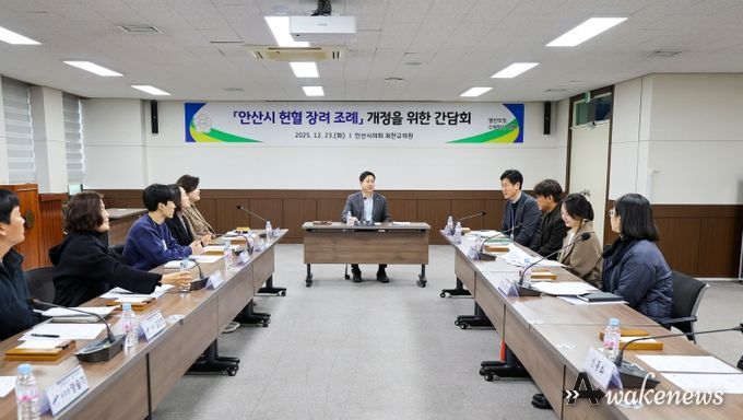 어웨이크뉴스 오경하 기자 | 안산시의회 최찬규 시의원(사동·사이동·해양동·본오3동)은 지난 23일 안산시의회 3층 대회의실에서‘안산시 헌혈 장려 조례’ 개정을 위한 간담회를 개최했다.