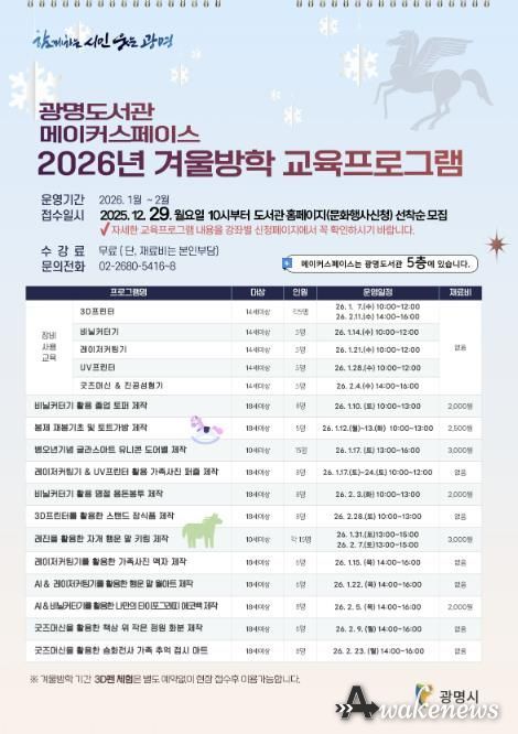 어웨이크뉴스 오경하 기자 | 광명시 광명도서관은 오는 29일부터 ‘메이커스페이스 2026년 겨울방학 교육 프로그램’ 참가자를 모집한다.