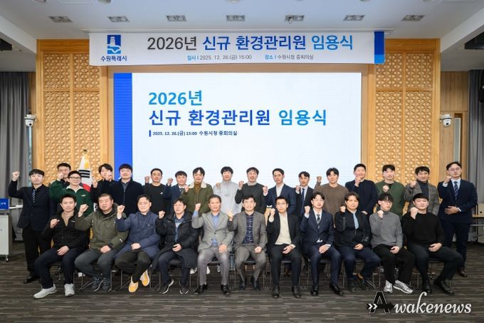 어웨이크뉴스 오경하 기자 | 수원특례시가 26일 시청 중회의실에서 2026년 신규 환경관리원 임용식을 열고, 신규 임용자 21명에게 임용장을 수여했다.