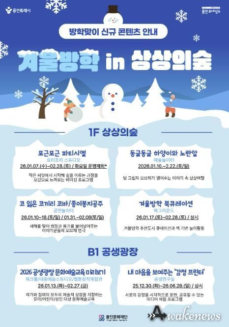 어웨이크뉴스 오경하 기자 | 용인문화재단은 2026년 겨울방학을 맞아 복합문화공간 용인어린이상상의숲과 용인문화도시플랫폼 공생광장에서 아이들과 가족이 함께 즐길 수 있는 다양한 신규 콘텐츠를 선보인다.
