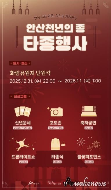 어웨이크뉴스 오경하 기자 | 안산시는 오는 31일 오후 10시부터 화랑유원지 단원각에서 ‘2026 안산 천년의 종 타종 행사’를 개최한다고 30일 밝혔다.