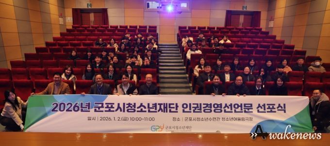 어웨이크뉴스 오경하 기자 | 군포시청소년재단은 2026년 1월 2일, 군포시청소년수련관 4층 청소년어울림 극장에서 전 직원 대상 인권경영 선언문 선포식을 개최했다. 이번 행사는 재단 임직원 모두가 참여하여, 새해를 맞아 조직 내 인권경영 실천 의지를 공유하고 상호 존중과 인권 존중의 문화를 강화하기 위해 마련됐다.