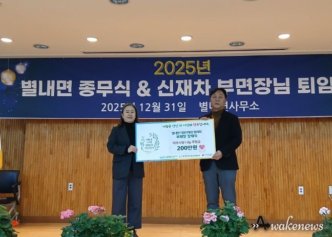 어웨이크뉴스 오경하 기자 | 남양주시는 지난달 31일 열린 ‘2025년 별내면 종무식’에서 별내면 기관단체장협의회가 지역 내 취약가구 지원을 위해 후원금 200만 원을 별내면 지역사회보장협의체에 기탁했다고 2일 밝혔다.