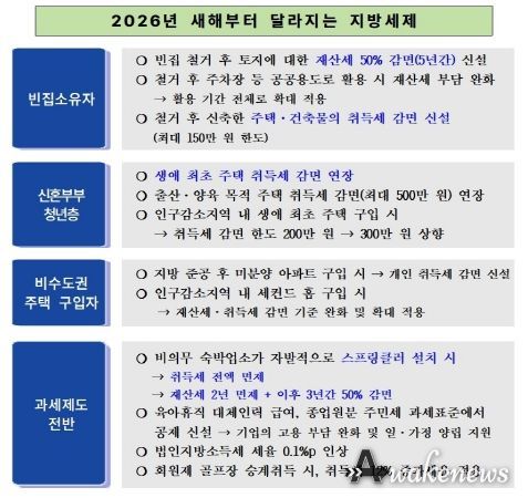 이번 개정은 △빈집 정비 △출산·양육 주택 취득 지원 △지역 균형발전 △공정 과세체계 구축에 중점을 두고 추진됐다.