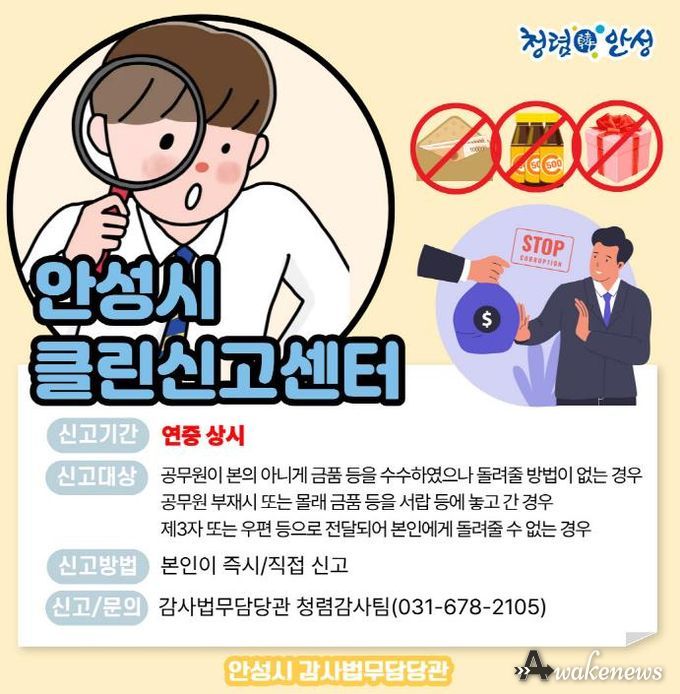 어웨이크뉴스 오경하 기자 | 안성시는 시민들에게 신뢰받는 공정하고 투명한 행정 서비스를 제공하기 위해 ‘클린신고센터’를 연중 상시운영하며 청렴한 행정문화 정착에 힘쓰고 있다고 밝혔다.