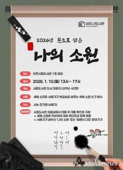 어웨이크뉴스 오경하 기자 | 이천시립도서관은 2026년 병오년 새해를 맞아 시민의 한 해 소망과 다짐을 서예가가 붓글씨로 써주는 '2026년 붓으로 담은 ‘나의 소원’' 행사를 오는 1월 10일 오후 1시부터 5시까지 시립도서관 1층 책마당 로비에서 운영한다.