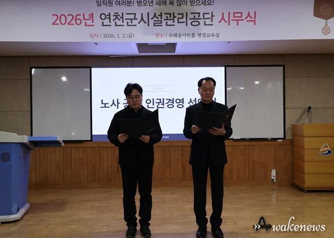 어웨이크뉴스 오경하 기자 | 연천군시설관리공단은 1월 2일 시무식 행사를 통해 노사 공동 인권경영 선언식을 개최했다고 밝혔다. 이번 행사는 새해를 맞아 노사가 함께 인권 중심의 경영을 다짐하며 2026년의 첫 발을 내딛기 위해 마련됐다.
