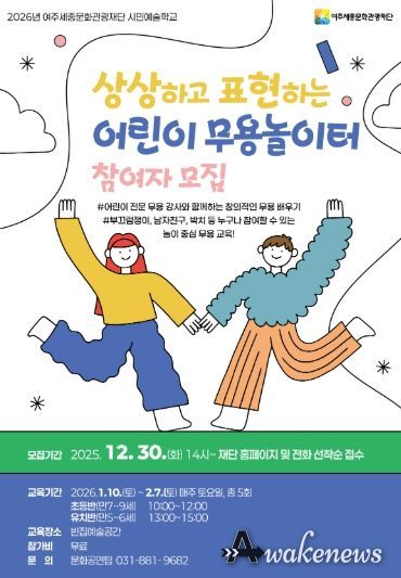 어웨이크뉴스 오경하 기자 | 여주세종문화관광재단은 오는 1월 10일부터 시민예술학교 '상상하고 표현하는 어린이 무용 놀이터'를 진행한다.