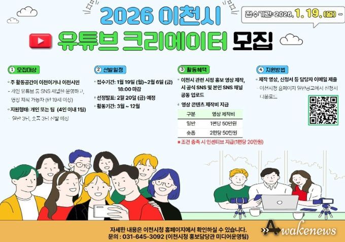 어웨이크뉴스 오경하 기자 | 이천시는 오는 2월 6일까지 2026년 이천시 유튜브 영상크리에이터 3기를 모집한다고 9일 밝혔다.
