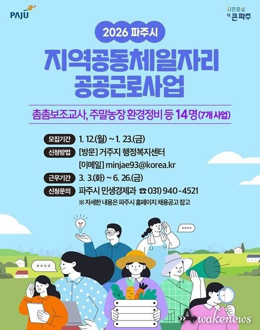 어웨이크뉴스 오경하 기자 | 파주시가 오는 23일까지 2026년 상반기 지역공동체 일자리 및 공공근로사업 참여자 14명을 모집한다고 밝혔다.